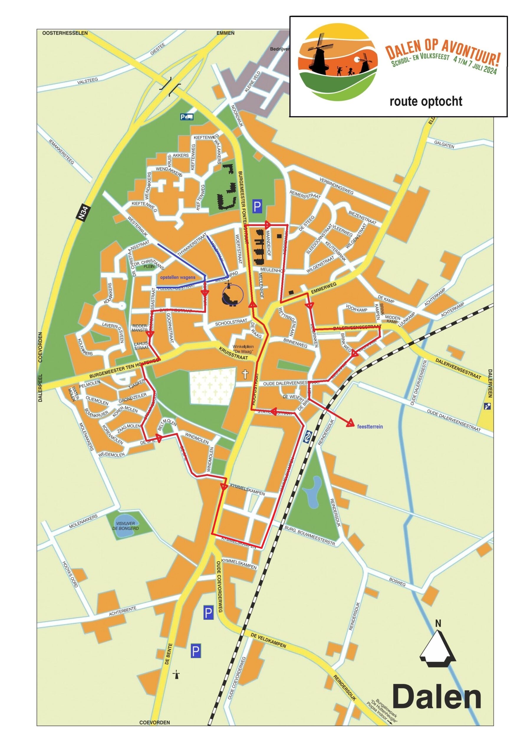 start: Schoolplein -> Westerwijk/Fledderusstraat, Ballandstraat, Mr Cassastraat, Burg. ten Holteweg, Stellingmolen, De Spil, De Bente, Kymmelskampen, Stationstraat, Hoofdstraat, Burg. Fonteinstraat, Thyakkerstraat, Noordwijk, Emmerweg, De Brinken, Dalerveensestraat, Luunkamp, Oude Dalerveensestraat, De Brinken, Reindersdijk -> Feestterrein